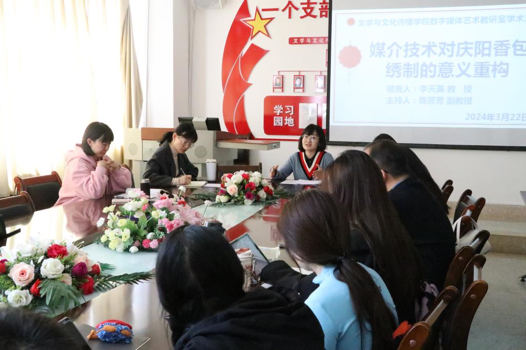 3月22日下午,由文学与文化传播学院数字媒体艺术和网络与新媒体教研室联合举办的学术沙龙活动在四号教学楼208会议室举行。此次沙龙活动由李天英老师主讲,陈芳芳老师主持,余岩松、吴琼、朱艳、王桂丽、王蕴琦等老师以及2022级和2023级文艺学方向研究生参加。