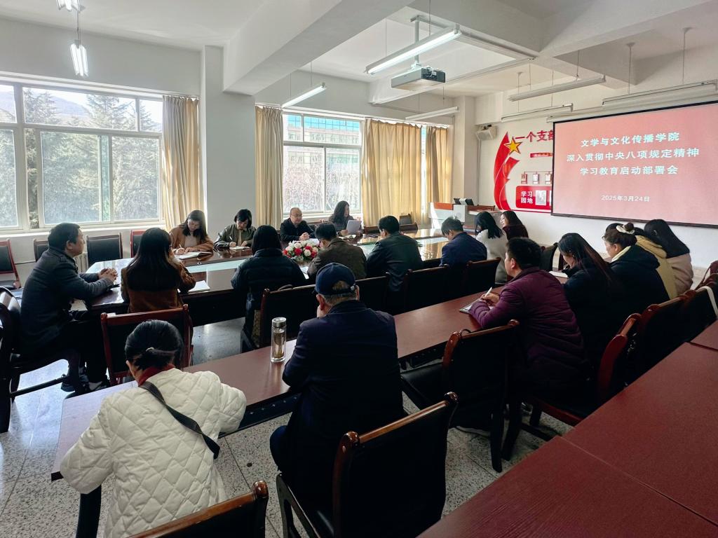 3月24日,文学与文化传播学院召开深入贯彻中央八项规定精神学习教育动员部署会,传达学习中央、省委党的建设工作领导小组会议精神和《英国365公司官网开展深入贯彻中央八项规定精神学习教育工作方案》要求,对学院开展深入贯彻中央八项规定精神学习教育进行动员部署。