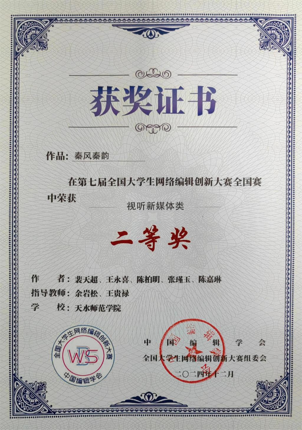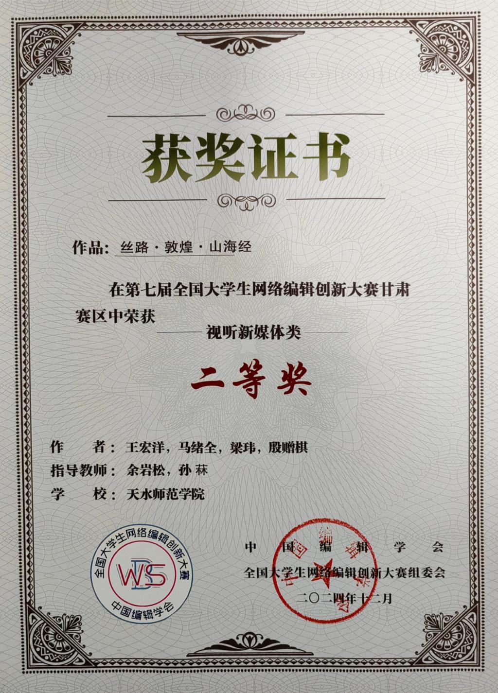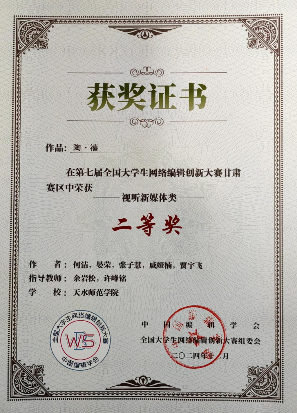 在文学与文化传播学院王贵禄教授及余岩松、许峰铭、程琦、孙菻等教师的指导下,2021级戏剧影视文学专业及网络与新媒体专业裴天超、王永喜、陈柏明等同学,跨专业联合拍摄的纪录片《秦风秦韵》,获得第七届全国大学生网络编辑创新大赛全国赛“视听媒体类”二等奖;2021级戏剧影视文学专业何洁、晏荣等同学拍摄的纪录片《陶·禧》;2022级网络与新媒体专业王宏洋、马绪全等同学创作的创意短视频《丝路·敦煌·山海经》获得甘肃赛区“视听媒体”类二等奖,2021级戏剧影视文学专业张带霞、陈婷婷等拍摄的纪录片《焰舞长空,古今共鸣》荣获三等奖。