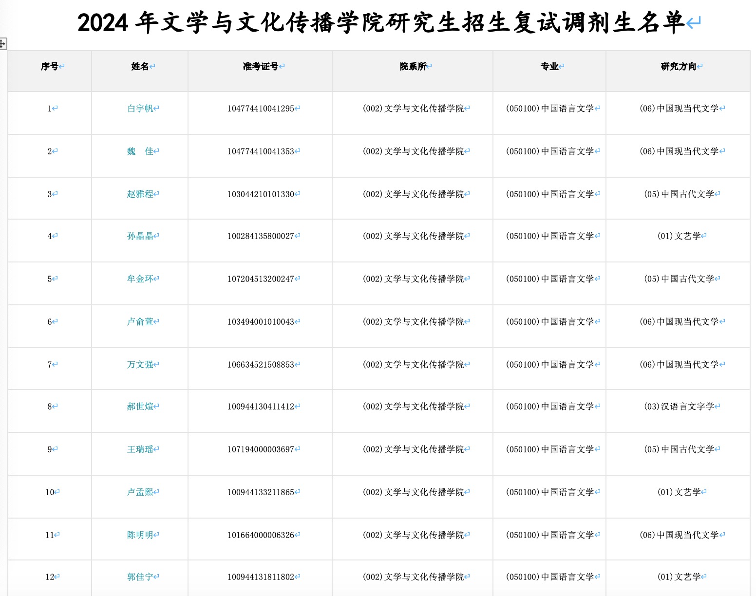 2024年文学与文化传播学院研究生招生复试调剂生名单