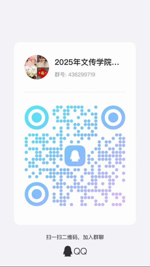 2025年文传学院中国语言文学研究生调剂复试即将开始,为方便各位考生,本学院设立1个复试qq群:2025年文传学院中国语言文学研究生调剂复试群,群号为:436299719。