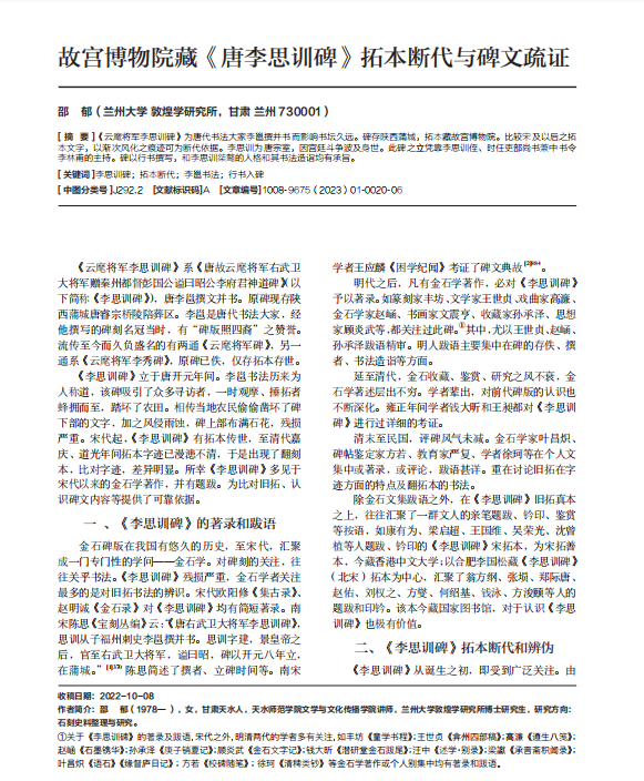 编者按:2023年1月,南京艺术学院学报《美术与设计》刊发了我校文学与文化传播学院教师邵郁的论文《故宫博物院藏<唐李思训碑>拓本断代与碑文疏证》,文章已收录于知网。