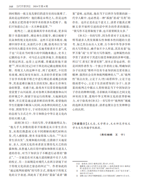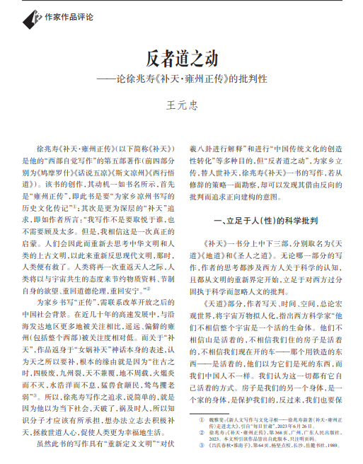 编者按:2024年4月,《当代作家评论》期刊刊发了我校文学与文化传播学院教授王元忠的文章《反者道之动——论徐兆寿<补天·雍州正传>的批判性》。文章已收录于知网。全文如下: