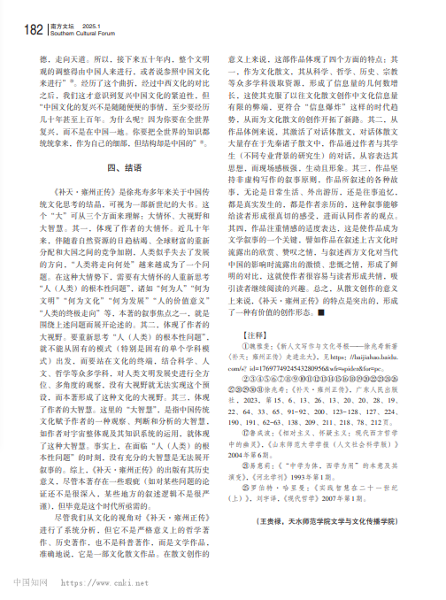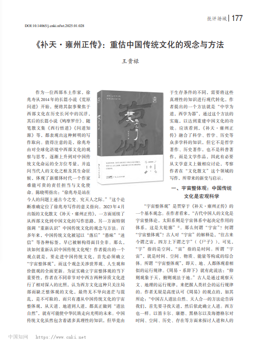 编者按:2025年《南方文坛》刊发了文学与文化传播学院教授王贵禄的文章:《<补天·雍州正传>:重估中国传统文化的观念与方法》,文章已收录于知网。全文如下: