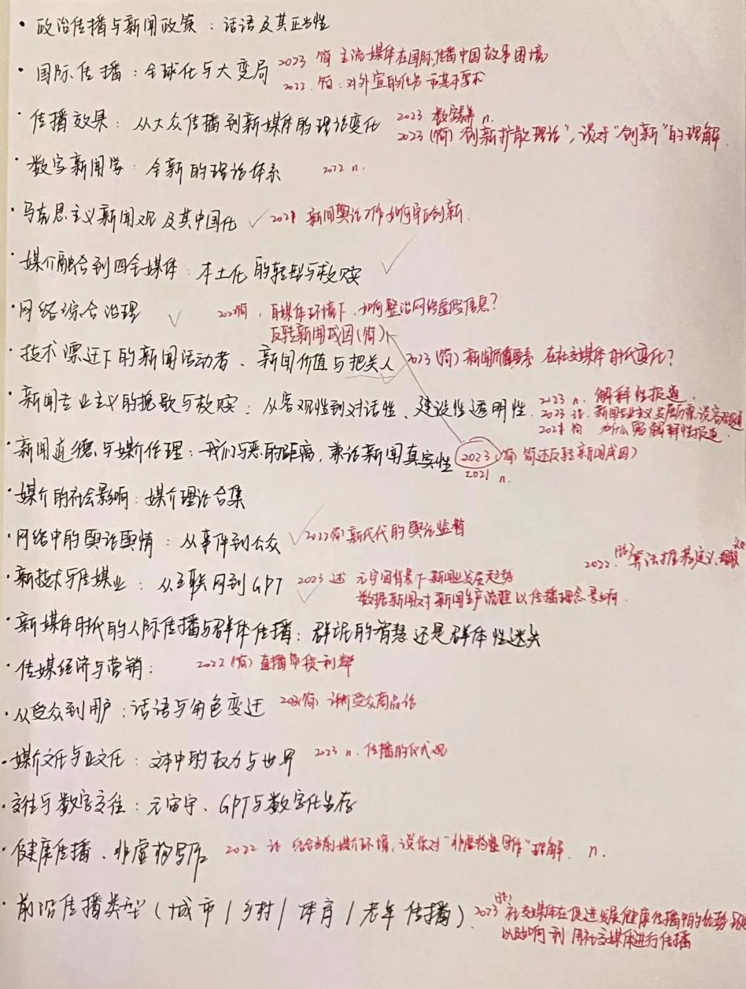 参考书/笔记的再浓缩:尽管现成笔记已经是参考书的浓缩版了,但笔记也依旧有上百页,记忆起来依然困难。所以就需要对知识点进行再次凝练和浓缩,才能记得更牢固。先在空白A4纸上,写出知识点名称,然后在下面写出知识点的关键词。因为每一个知识点都有一个考点,并且老师按点给分。例如经典的传播效果理论沉默的螺旋,就可以写提出背景(伊丽莎白诺伊曼、《沉默的螺旋:舆论——我们的社会皮肤》、联邦德国议会竞选)、基本观点(优势意见表达,反之沉默)、理论评价(优/不足),不需要大篇幅写,只需要写关键词,这样就可以在考场上根据记忆的关键词进行编写(考场上的状态就是半编半记忆,甚至编的占比会更高)。