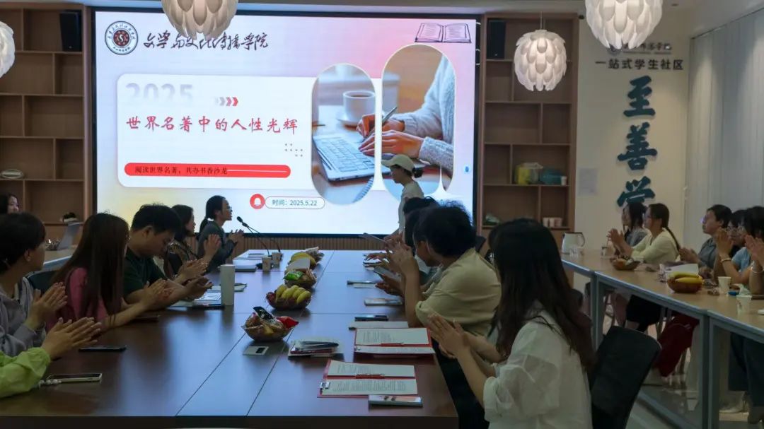 2025年5月22日下午,文学与文化传播学院第24届读书月"阅读马拉松"主题周系列活动之"世界名著中的人性光辉"跨文化阅读沙龙,在至善学堂二楼如约启幕。这场以书为媒、跨越时空的文化盛宴,吸引了众多师生共赴经典之约,通过深度解读世界名著,探寻人性深处的璀璨光芒,搭建起多元文化交流的思想桥梁。