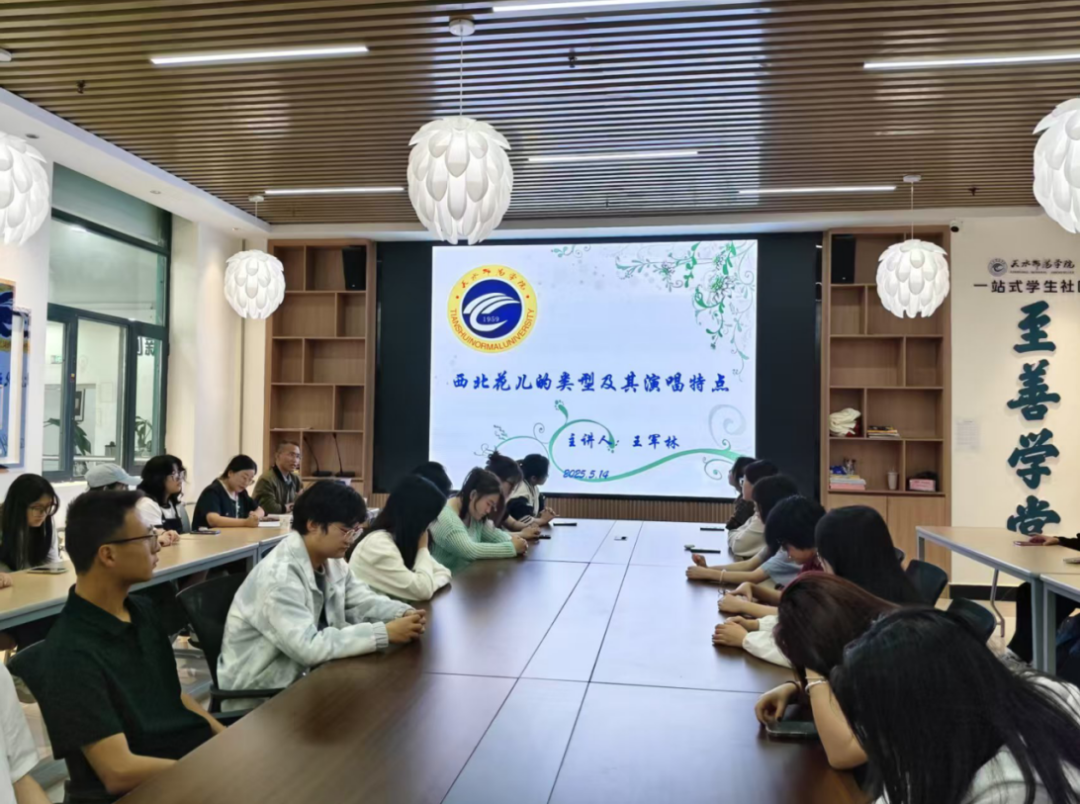 在深度解析环节,王老师通过自身实践调研经验,解构了"花儿"演唱的三大核心技艺:尖音唱法——如云雀穿云的真假声转换技法;苍音唱法——展现黄土高原厚重底蕴的"满口腔"发声;尖苍音唱法——刚柔并济的复合型演唱方式,现场播放的《眼泪花儿把心淹了》经典曲目,配合王老师对尖音唱法的示范讲解,让非遗艺术从教科书走进现实,使得同学们沉浸在跨越时空的文化对话中。