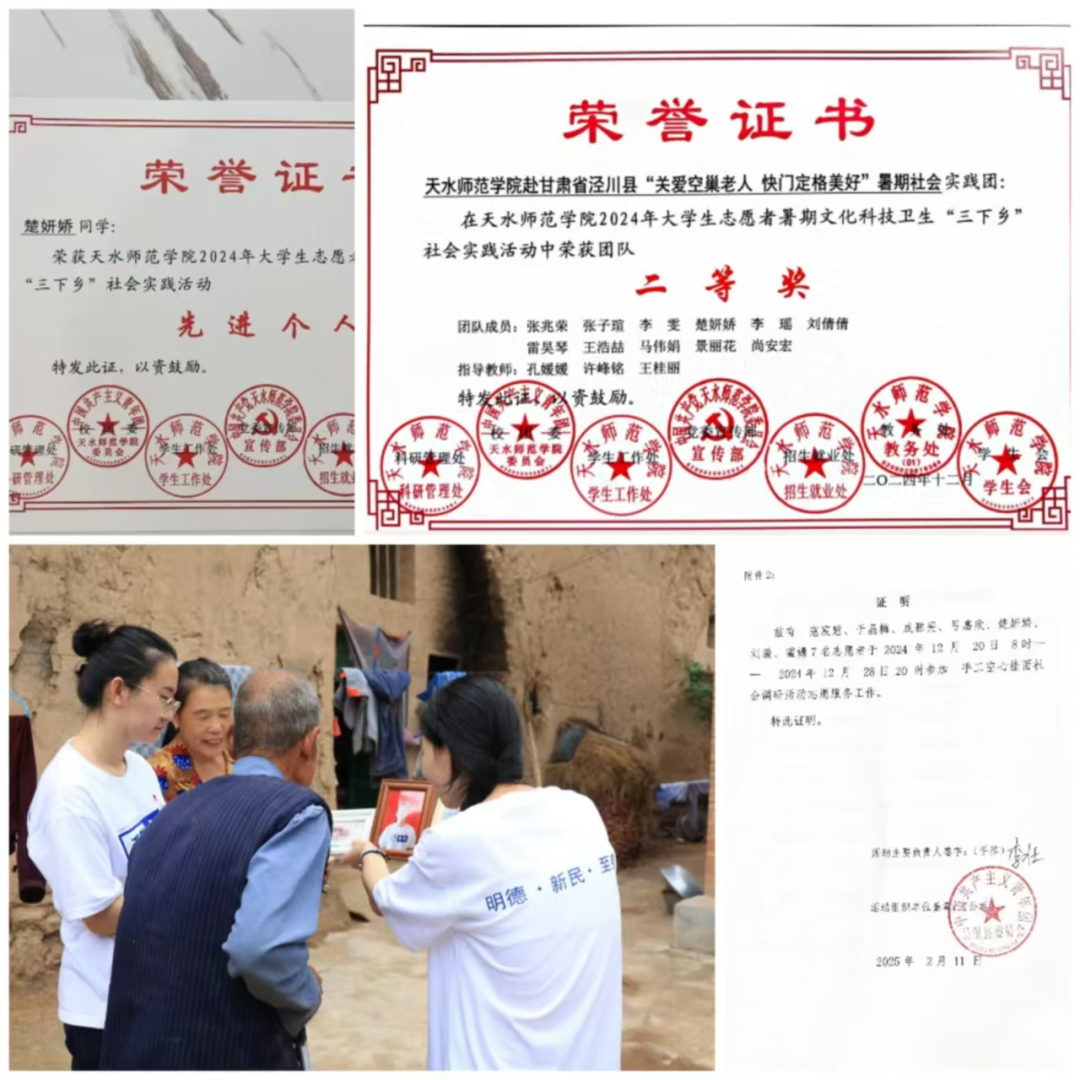 生活上,她态度端正,作风优良,主动探索个人兴趣和个人特长,培养多方面的能力,在学会学习的同时合理安排个人的生活内容,不断在生活中汲取学业上的创造力和精神上的生命力,进而促进个人德智体美劳的全面发展。在学校里,她积极参加各种实践活动,结合所学专业进行社会文化宣传,用自己的热情和信仰感染着她周围的每一个人。她是一个富有社会正义感和责任心的人,2024年7月,她主动参与学校组织的赴甘肃省泾川县“关爱空巢老人 快门定格美好”的暑期“三下乡”活动,主动关心当地老人的生活起居,解决他们的烦心事,用热情和温暖感染着当地的驻村老人。同时,她也参与了陕西师范大学赴陕西吴堡手工空心挂面社会调研报告志愿服务活动。同年12月,她荣获了英国365公司官网暑期“三下乡”社会实践“先进个人”荣誉称号,她所在的社会实践团队获得了校级二等奖。她深刻理解“知人者智,自知者明”的含义,因此她不仅关心社会、关注时事、乐善好施、急人之急,还时常反思自己的思想和行为,力求塑造更好的自己。