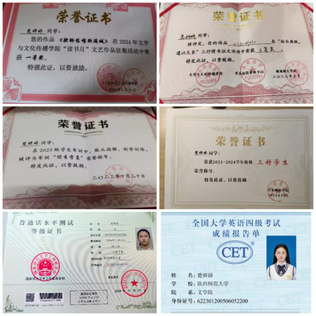 学习上,她刻苦认真、拼搏向上,勤奋学习,立志成才,时刻保持作为一个学生对学习和学术的积极性和主动性。她努力学习语言学、文学史等理论知识,积极主动参加学科研讨活动和讲座,深入挖掘学术方面的信息和资源,努力拓宽自己的学术视野。她把理想付之于实际行动。总是在各方面严格要求自己,虚心接受老师的教育、帮助,在老师及同学们的帮助下,学习成绩取得了很大进步,坚持不懈的努力终于换来了丰硕的成果:2024学年取得了班级综测第一、学业成绩第一的好成绩。2023年11月普通话水平测试中获得二级甲等,2024年10月获得校级一等奖学金,2024年12月获得校级“三好学生”称号,2025年3月通过全国大学生英语四级考试。她的优秀表现也使她获得了赴陕西师范大学进行交流培养的宝贵机会。