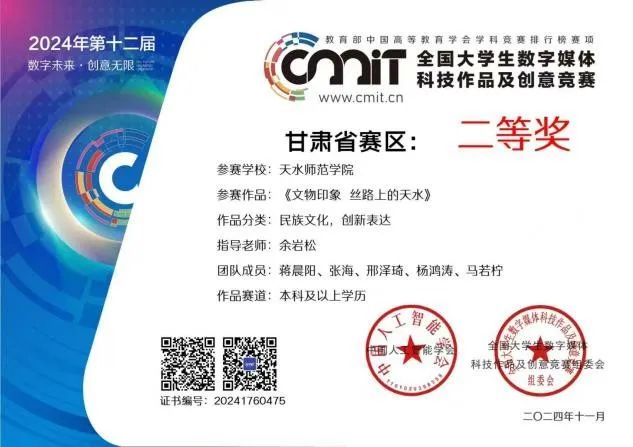 除了专业学习,他还积极投身于各类学术竞赛和技能比赛。2024年11月,在第七届全国大学生网络编辑创新大赛中,他凭借自己扎实的专业知识和创新的思维,荣获视听新媒体类“甘肃赛区优秀奖”;在第十二届全国大学生数字媒体科技作品及创意竞赛中,他更是凭借出色的表现,荣获“民族文化,创新表达”类“甘肃赛区二等奖”和“全国总决赛三等奖”。这些荣誉的取得,不仅是对他过去努力的肯定,更是激励他在未来创作道路上不断前行的动力,让他对自己的专业能力有了更坚定的信心。