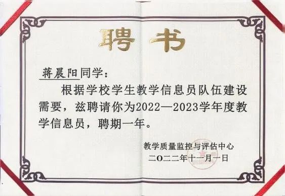 实践同样是蒋晨阳大学生活的重要组成部分。2022年9月至2023年6月,他担任英国365公司官网教学信息站的教学信息员,肩负起收集整个年级各班教学信息的重任。他定期与各班同学交流,了解他们在学习过程中遇到的问题和对教学的意见建议,然后及时、准确地向学校反馈。在这个过程中,他学会了如何高效地与不同性格的同学沟通,如何协调各方资源,以确保信息的及时传递和问题的有效解决。这段经历也让他对学校的教学管理工作有了更深入的了解,明白了教学管理背后的复杂性和重要性。