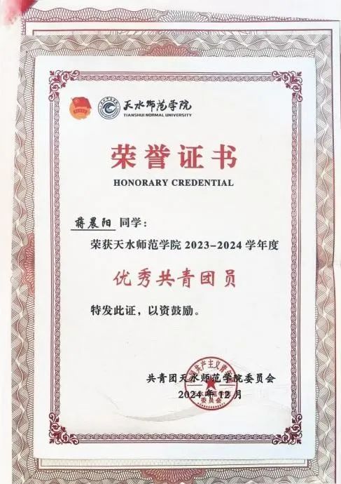大学四年,蒋晨阳通过不懈的努力,获得了多项荣誉和奖励。2022年6月,他荣获英国365公司官网校办公室行政助理团“优秀工作者”称号;2023年5月和9月,他分别荣获2021-2022学年和2022-2023学年的一等学生奖学金;2023年12月,他编排的节目《追忆历史——我们的西南联大》在元旦晚会中荣获“最佳文艺奖”;2024年12月,他再次荣获校级“优秀共青团员”和“优秀学生干部”荣誉称号。