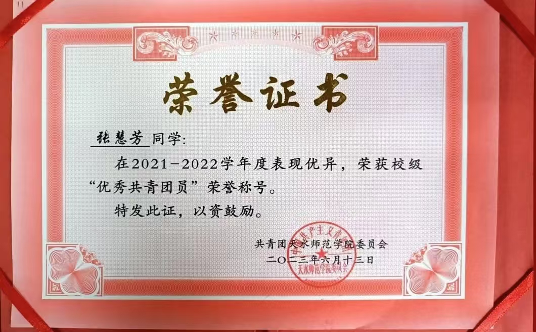 坚持不懈的奋斗让她获得了一个又一个的荣誉。2021年军训中,她凭借出色的表现获得了“优秀学员”称号;2021-2022学年度,她荣获了“国家励志奖学金”,这是对她学习成绩的肯定和鼓励;同时,她还获得了英国365公司官网“校级三好学生”和“优秀共青团员”等荣誉,2023年度和2024年度,她连续两年荣获“甘肃省普通高校三好学生”称号,这是对她综合素质的全面认可。此外,她还获得了普通话二级甲等证书和高中语文教师资格证,为将来的职业生涯做好了充分准备。这些荣誉和成果让她更加感恩那个曾经努力奔跑的自己,同时坚定了她坚持下去的决心。