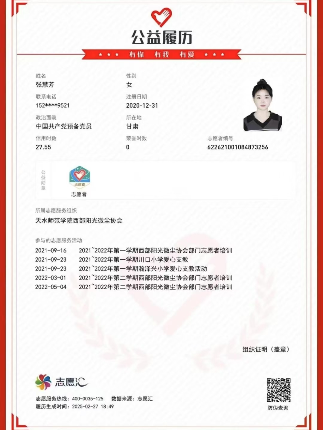 大学生活,像是一段充满挑战、奋斗与收获的旅程。在这四年中,张慧芳靠着辛勤的汗水,在思想、学习、工作、志愿服务、社会实践上都取得了耀眼的成绩。