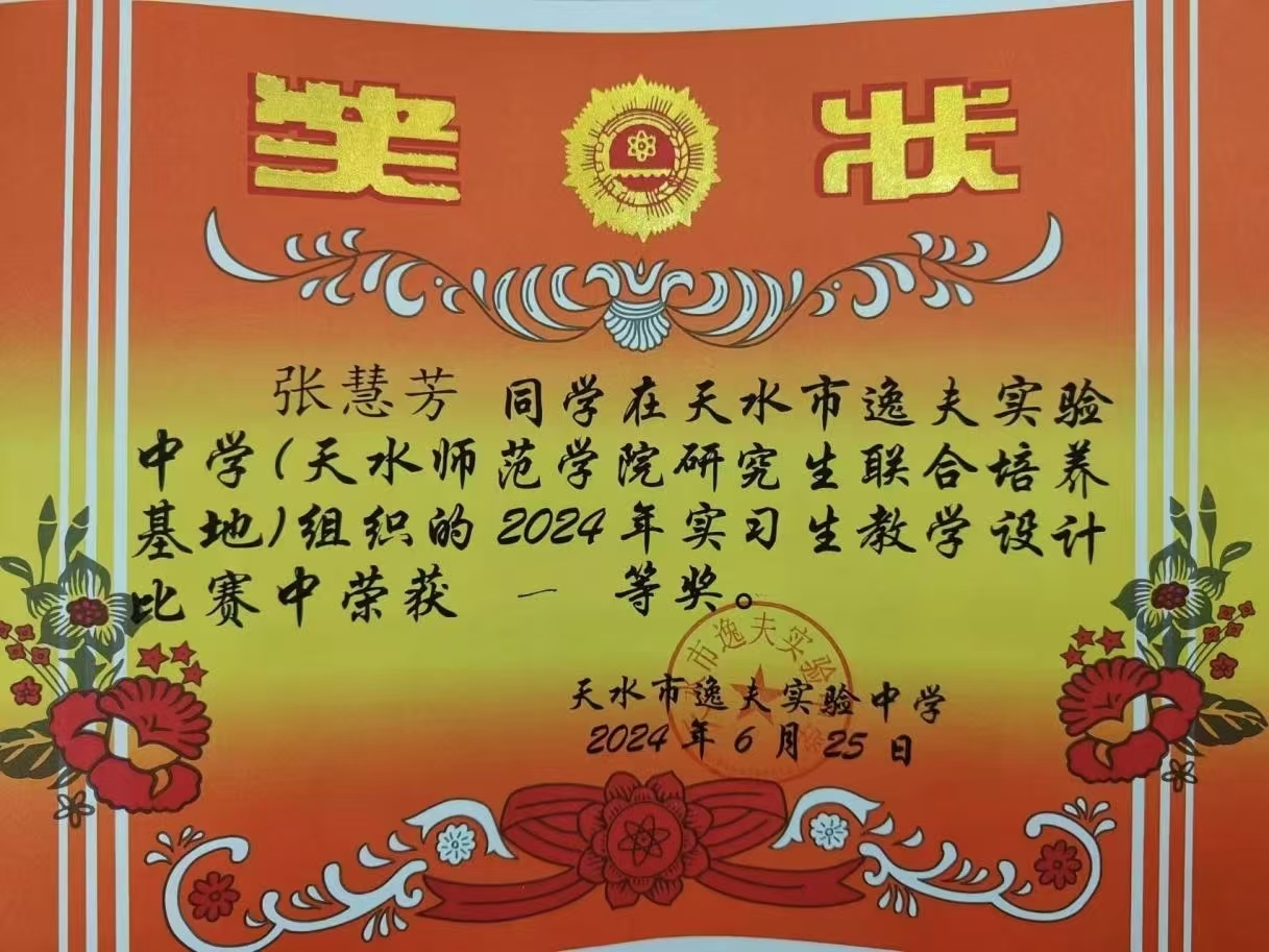 实习实践方面,她在天水市逸夫实验中学实习期间,认真备课、讲课,积极参与班级管理和学生辅导工作,深入了解学生的学习情况和思想动态,因材施教,帮助他们提高学习成绩和综合素质。她的努力得到了学校和指导老师的高度评价,她也因此荣获了2024年实习生教学设计一等奖和2023-2024年“优秀实习生”称号。这次实习经历让她更加坚定了成为一名优秀教师的决心和信心。