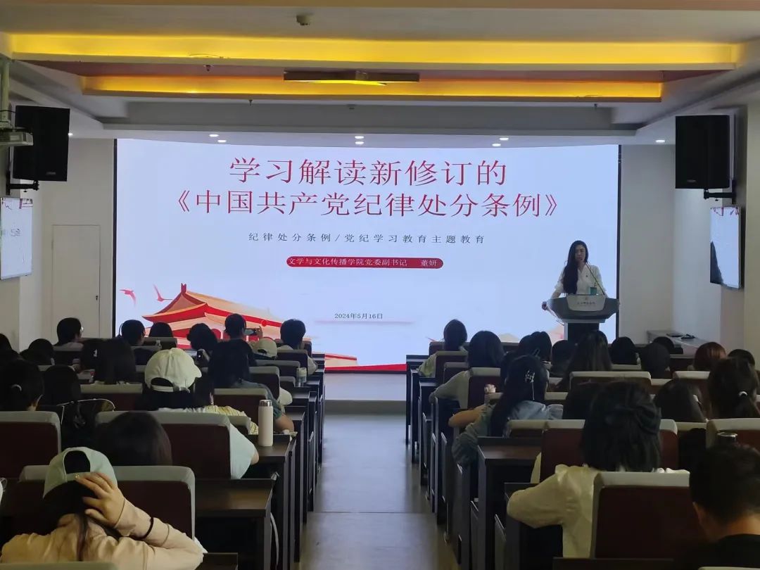 为深入学习贯彻习近平新时代中国特色社会主义思想,进一步增强学生党员和积极分子的纪律意识,筑牢思想防线,2024年5月15日下午14:30,文学与文化传播学院党委在马克思主义学院红色讲堂118室举办党纪学习教育专题党课。学院党委副书记董妍担任主讲,围绕新修订的《中国共产党纪律处分条例》(以下简称《条例》)进行深入解读。学院三个学生党支部全体党员、本期发展对象及全体入党积极分子参加学习。