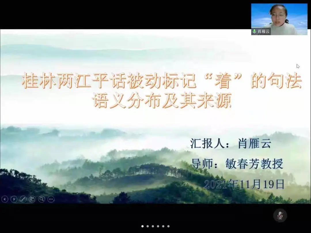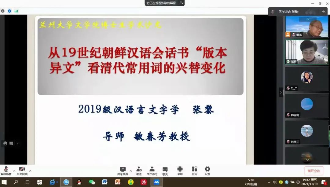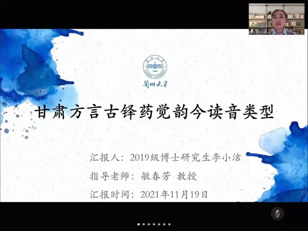 张黎做了关于《从19世纪朝鲜汉语会话书“版本异文”看清代常用词的兴替变化》的报告。在讨论环节,张黎与张美兰教授的交流,让同学们了解到如今教科书多样性,有的字出现了多个字形,有简繁字,有正俗体字,还有记音字,在做文献引用时,要用文献原字,但在论证中要加以说明。李小洁做了《甘肃方言古铎药觉韵今读音类型》的报告,认为根据甘肃方言古铎药觉韵不同音值形式可以分为河西型、陇中型和陇东型三类,让同学们了解到甘肃方言古铎药觉韵今读音类型中陇中型和河西型是本土方言类型,陇东型是受邻近关中方言影响后合并而成的新读音类型。肖雁云做了《桂林两江平话被动标记“着”的句法语义分布及其来源》的报告,从被动标记“着”在桂北平话及周边民族语言中的分布,句法结构、谓语构成、语义色彩,“着”的由来及语法化等方面做了详细阐述。
